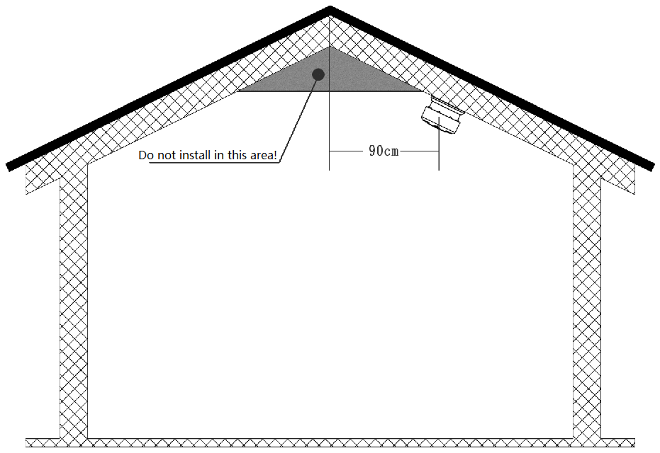 Si instala la alarma de humo en el techo inclinado o pico, la posición de instalación debe tener al menos 90 cm del punto más alto.